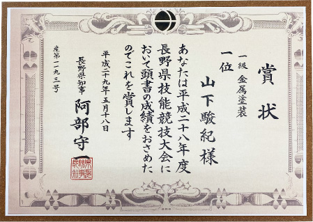 平成28年度長野県金属塗装技能競技大会 1位